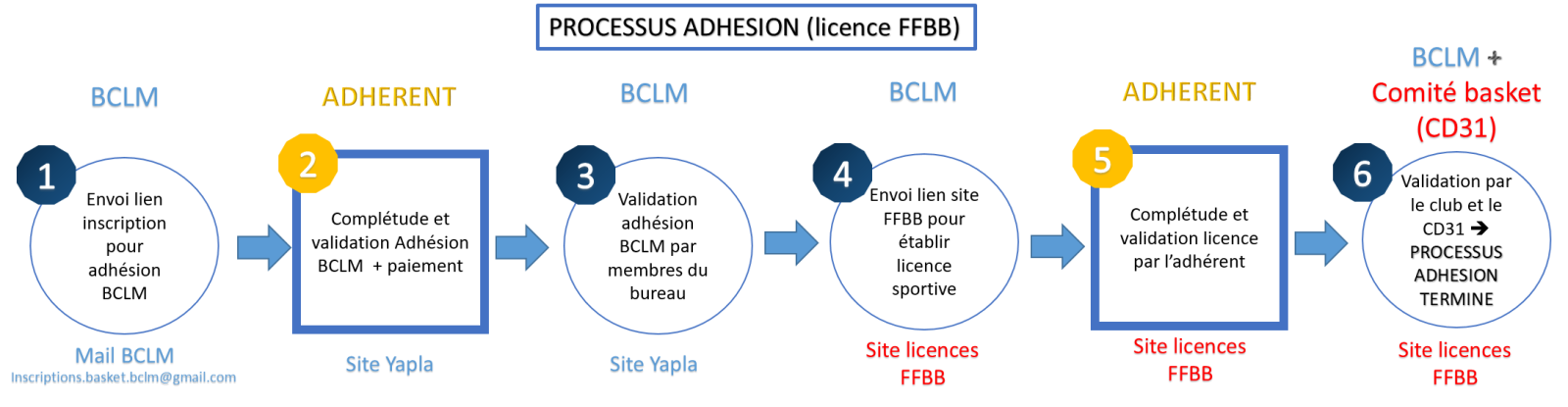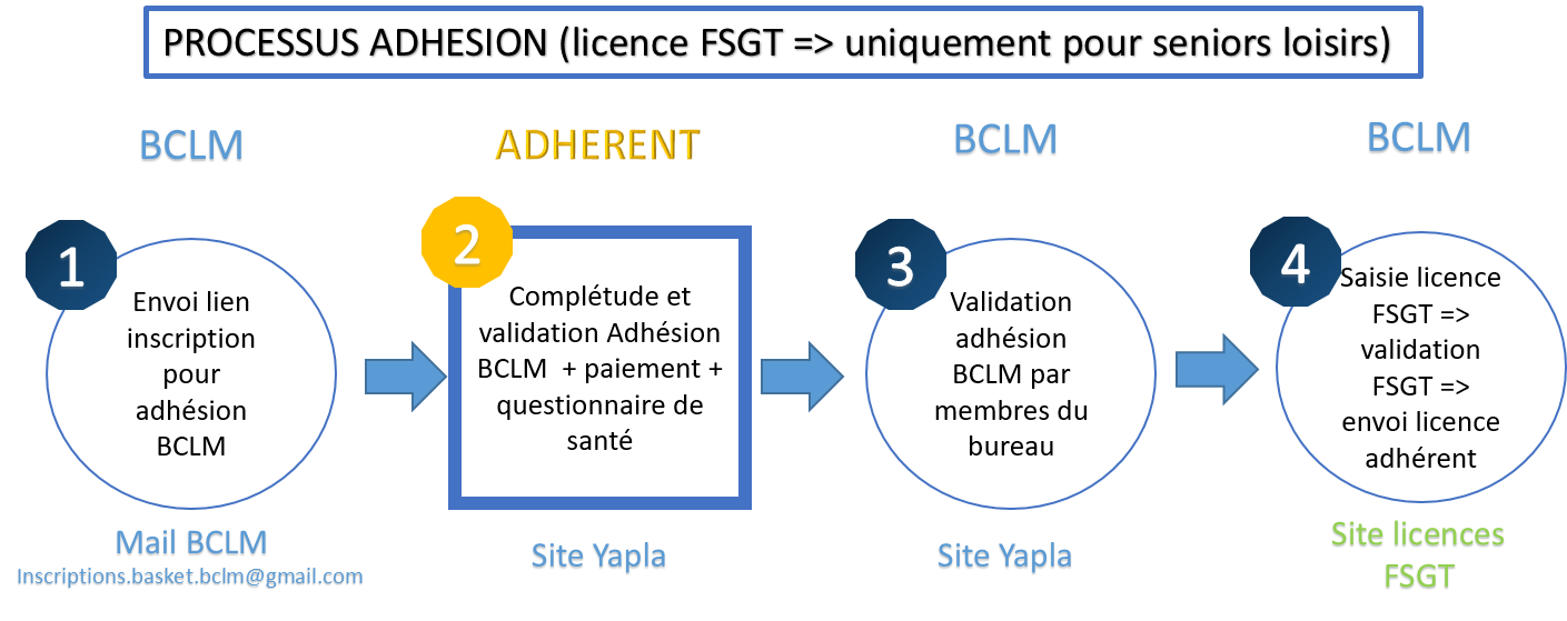 Ci-après les processus pour les adhésions, que ce soit avec une licence FFBB (action 2 et 5 de votre part) ou FSGT (action 2 de votre part) :