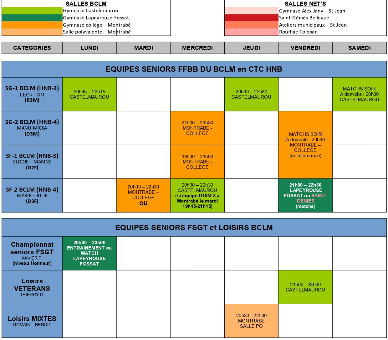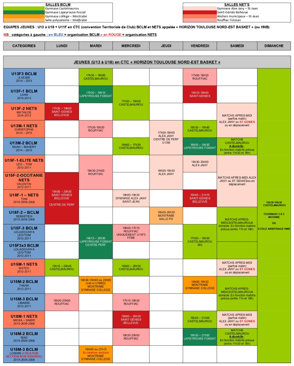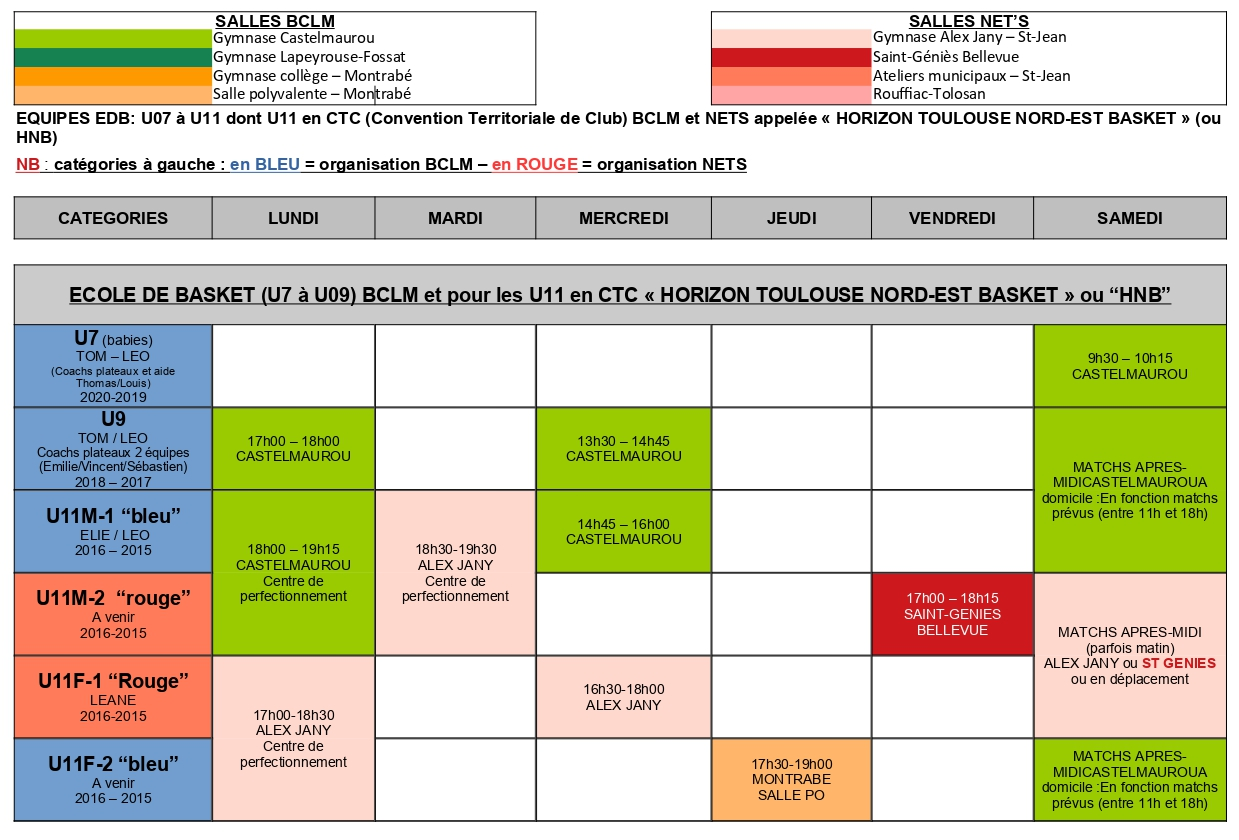 Pour les équipes "jeunes" et les U11 (2016 à 2008), ce planning comprend les équipes "portées", c'est à dire gérées, soit par le BCLM (catégorie à gauche en bleu), soit par le NET's (catégorie à gauche en rouge).